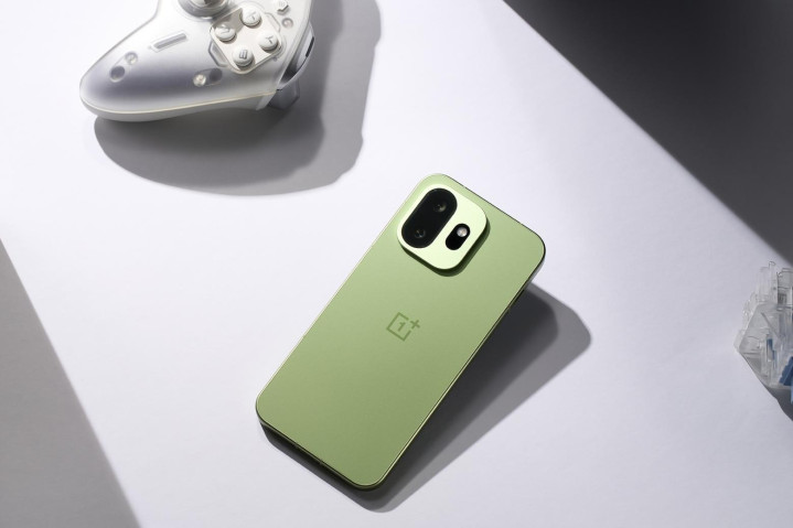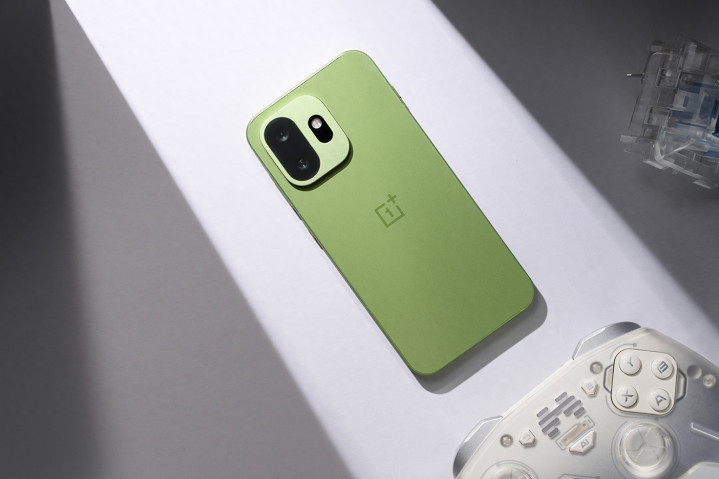 一加手机 · 绿色一加手机后面,带品牌鲜艳