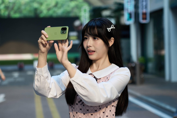 一加手机、女生 · 女新手持绿色一加手机拍照