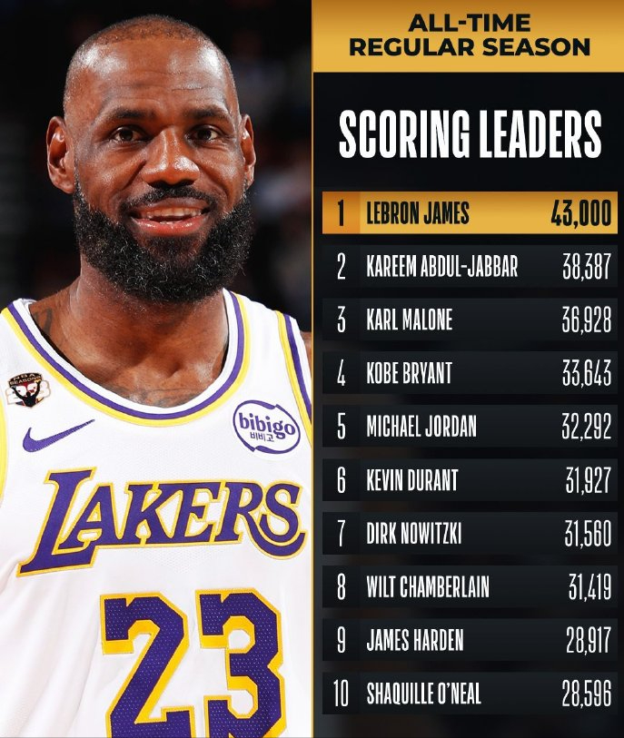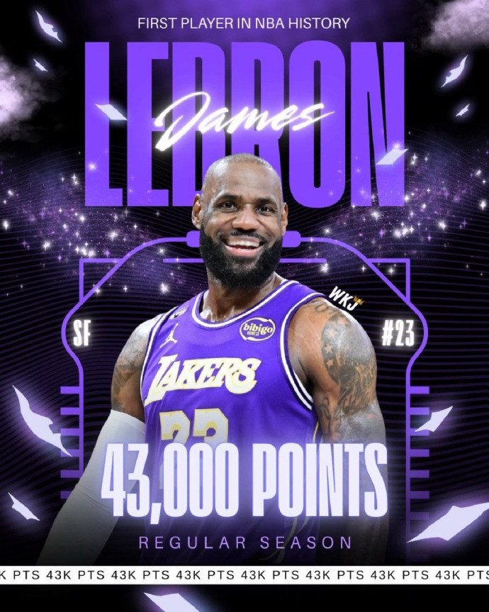 詹姆斯不仅也曾是历史得分王,况兼咫尺也曾把其他球员远远甩在死后,包括之前的历史得分王贾巴尔。贾巴尔的活命总得分为38387分,还不到39000分。詹姆斯咫尺也曾快率先贾巴尔快要5000分,这么的差距是很大的。詹姆斯亦然历史上咫尺独逐一位竣事了活命39000分、40000分、41000分、42000分、43000分里程碑的球员。