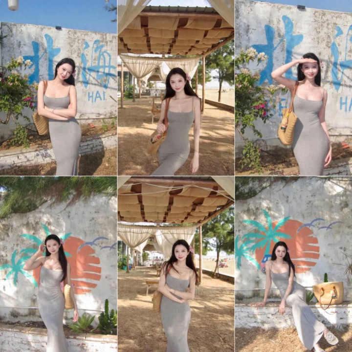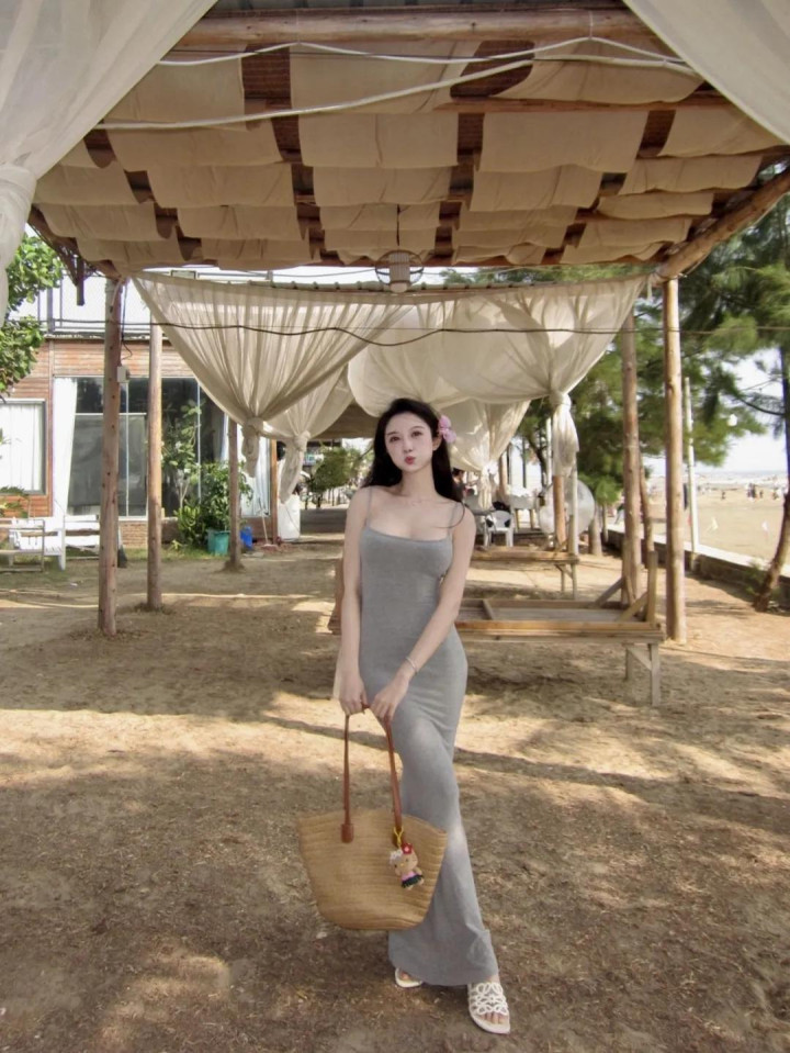 长裙拍照时双脚交叉站好,双手提着包,轻轻嘟嘴笑一下,这个姿势带点小俏皮,但合座依然很良善,裙子的长度和站姿会让画面显得好意思瞻念又不失气质。