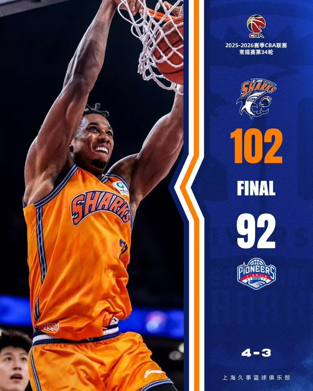北京时间4月3日晚间,CBA联赛第34轮,上海男篮主场迎战天津男篮,照旧获得14连胜的上海男篮延续着见效表率,最终102比92赢下衔接第15场见效赓续排行旧例赛榜首位置,跳跃第二名广厦胜场达到2.5场。