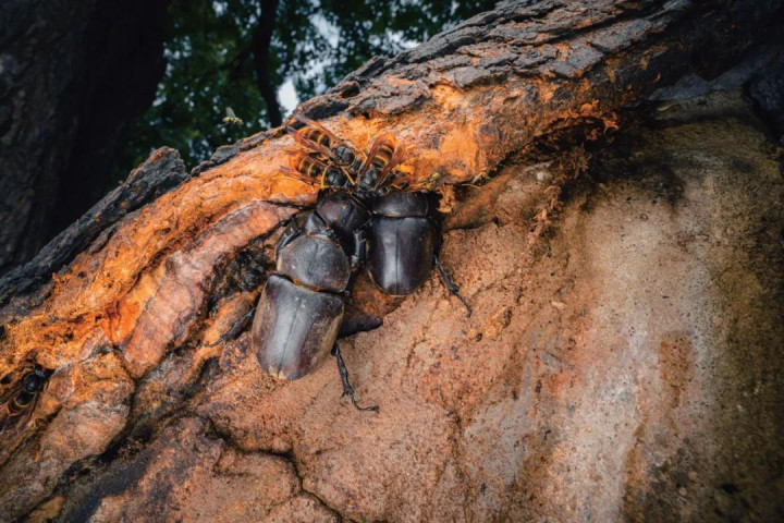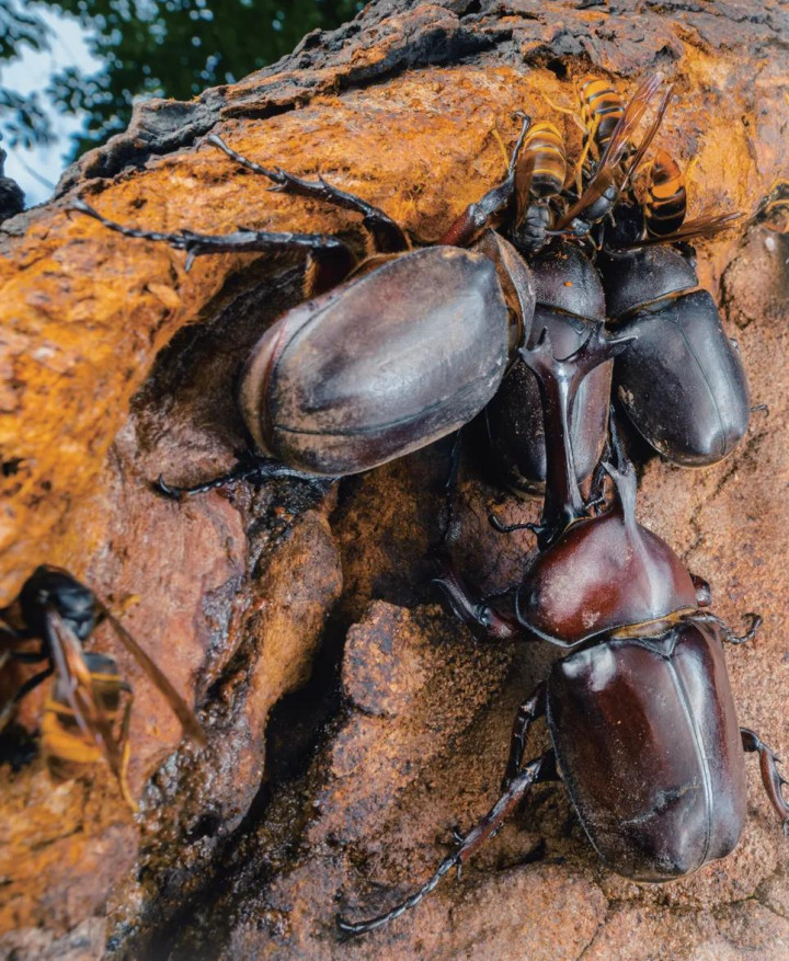 独角仙和黄蜂在争抢树干里的“糖水”
