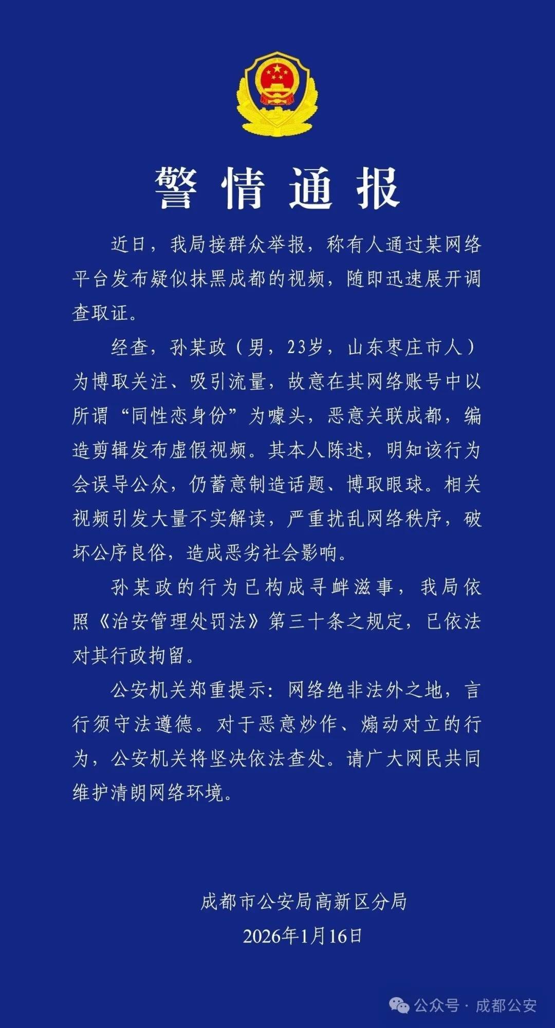 原标题:成齐公安通报:一男人为博流量毁伤城市形象,已被行政拘留