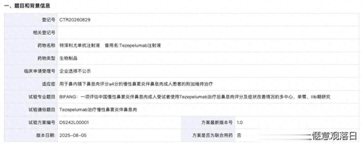 3 月 4 日,药物临床窥察登记与信息公示平台官网披露,阿斯利康登记了一项特泽利尤单抗(Tezepelumab)用于鼻内镜下鼻息肉评分 ≥4 分慢性鼻窦炎伴鼻息肉成东说念主患者附加防守调养的 IIIb 期临床商讨(BIFANG)。