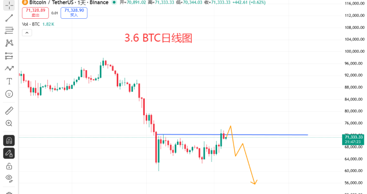 周四说陆续看跌,参考位置75000-77000区域,昨日最高反弹73000就延续下落了,日线小阴闭幕,天然提前下落了,但我并不合计空头能径直延续,这里原本即是一段震撼反弹结构,咫尺冲破前期撑抓当今处于测试阶段,若是底部70000近邻测试告捷,价钱还有陆续拉升的需求
