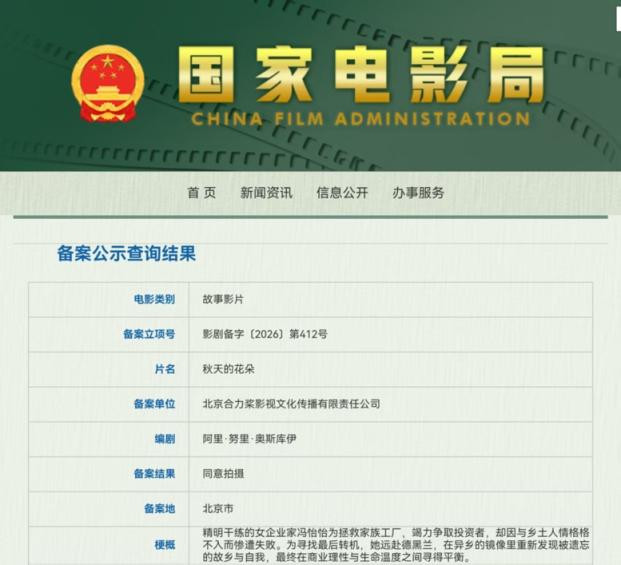 近日,国度电影局官网公示暴露,中国与伊朗连合制片的电影《秋天的花朵》负责得回拍摄备案许可,备案立项号为影剧备字〔2026〕第412号,这一音信标记着这部承载中伊东谈主文疏导责任的影片,负责迈入实验性规划阶段。